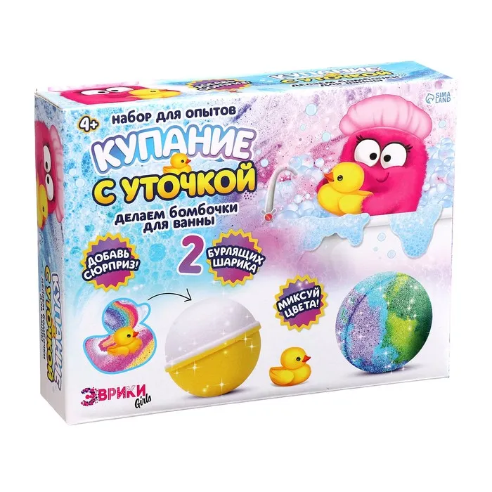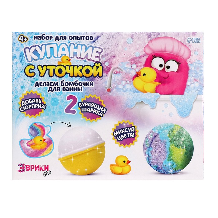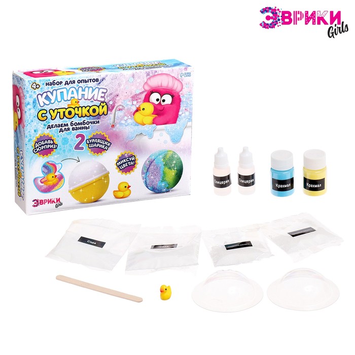 С набором для опытов «Купание с уточкой» ребёнок проведёт увлекательный эксперимент и самостоятельно сделает 2 бурлящие бомбочки для ванны.