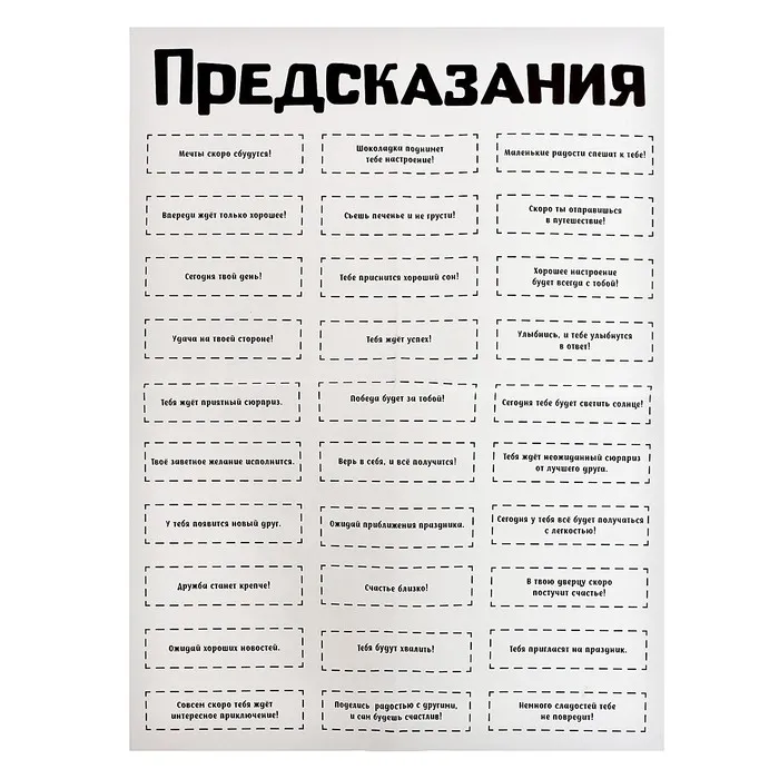- Добавьте в одну формочку колечко из набора, а во вторую — капсулу с предсказанием. Для этого разрежьте лист с предсказаниями на полоски. Закрутите полоски так, чтобы не знать, какое именно предсказание попадётся, выберите одно и поместите его в капсулу.