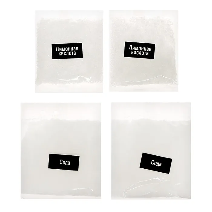 - Смешайте в стакане пакетик пищевой соды, крахмал и лимонную кислоту. Тщательно всё перемешайте, чтобы не было комочков.