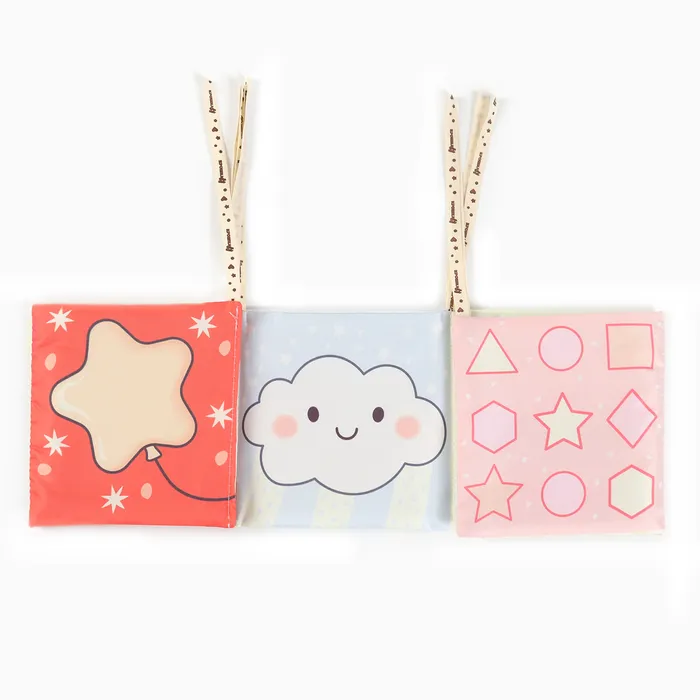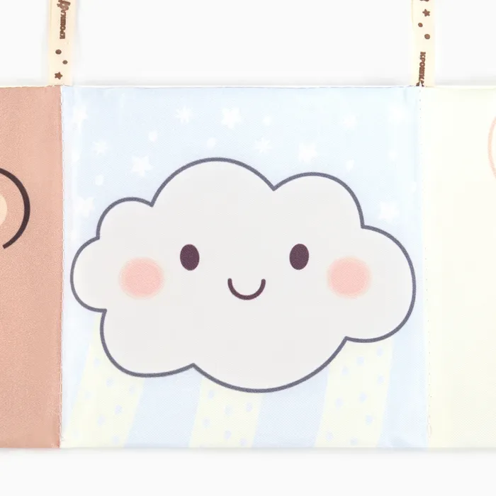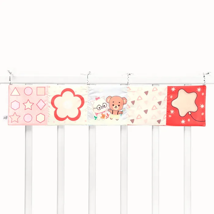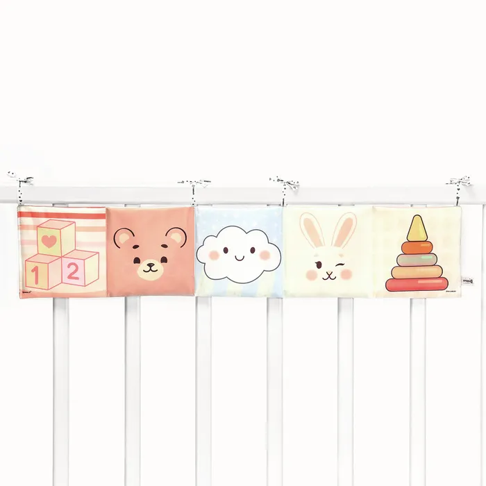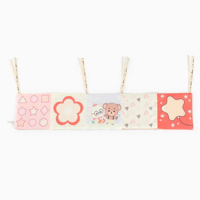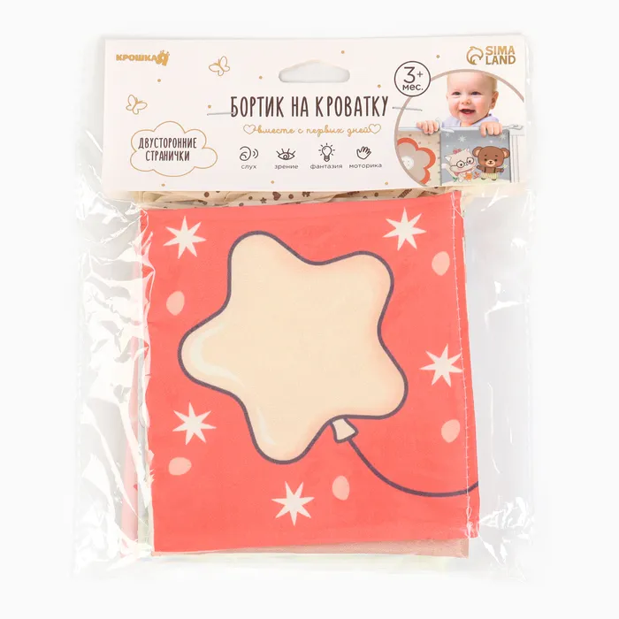 Мягкая книжка-бортик имеет красочные развивающие картинки, привлекающие внимание малыша. Книжка имеет ленточки за которые её можно подвесить на кроватку.