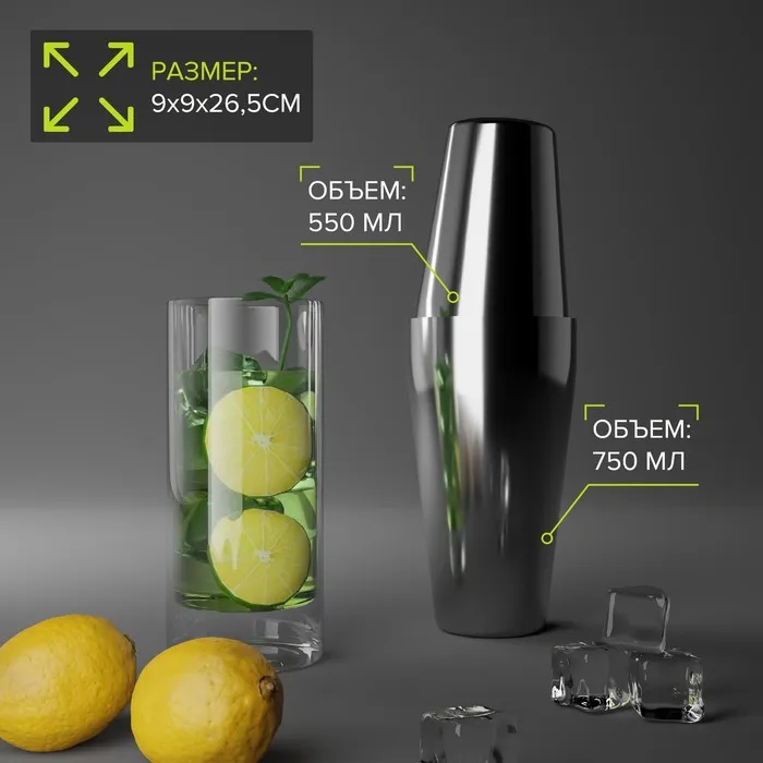 Бостонский шейкер из нержавеющей стали, 750+550 мл, 9×26.5 см, 304 сталь, серебряный — Характеристики