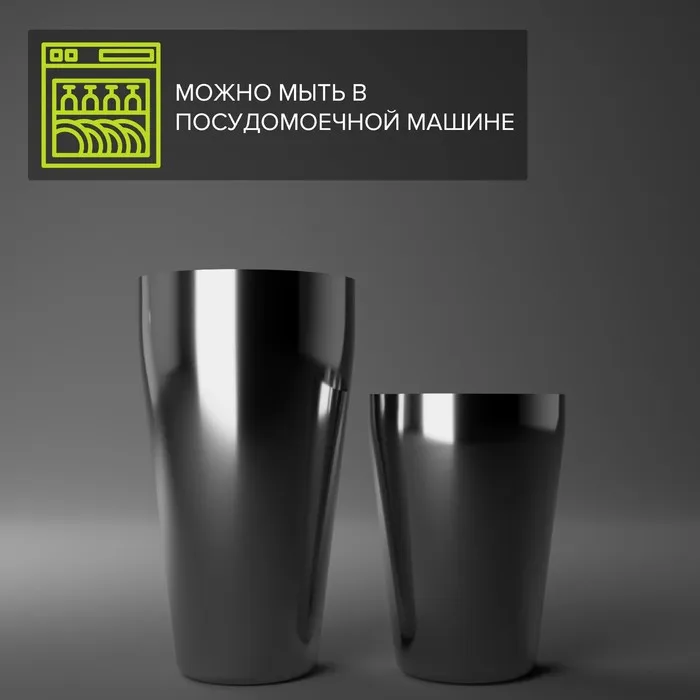Шейкер изготовлен из качественной нержавеющей стали, состоит из стакана для смешивания, сита для льда и крышки — мерного стакана.