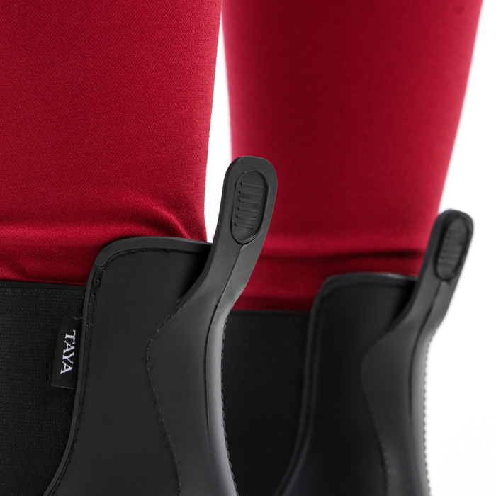 Ботинки для верховой езды бренда TAYA equestrianism – это идеальный выбор для тех, кто занимается конным спортом. Изготовлены из качественной полирезины, что гарантирует их долговечность и надежность при ежедневном использовании. Данный материал достаточно мягкий, очень гибкий и при этом не толстый, что обеспечивает комфорт, легкость и подвижность ступней и предотвращает пережимание ноги в работе. Сами по себе ботинки челси являются изначально оптимальным выбором для конников за счет конструкции – такие конные ботинки имеют не очень толстую подошву, что позволяет стопе быть подвижной и находиться в контакте со стременем. При этом важно, чтобы модель имела оригинальную конструкцию: обувь для верховой езды должна иметь небольшой каблук, чтобы не цепляться за амуницию, но и достаточно высокий, чтобы ограничивать полное попадание ноги в стремя. К тому же передняя часть ботинка должна быть точно высотой до голеностопа, чтобы предотвращать «цепляние» выступов на носке обуви за стремя спереди. Всё это мы учли, подобрав соответствующую требованиям форму, и протестировали наши ботинки для конного спорта с помощью тест-групп на практике.