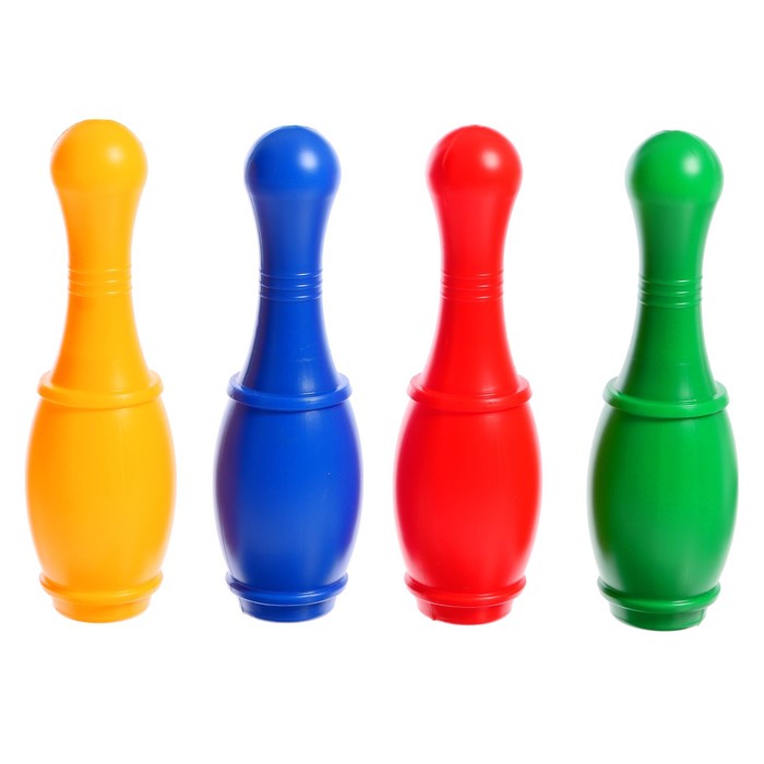 Набор состоит из 9 цветных кеглей и 4 шаров со специальными отверстиями для пальцев.