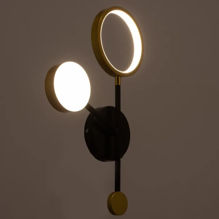 Свет, который держит ритм пространства. Двухрожковое LED-бра с черным металлическим корпусом и золотыми акцентами, 30 Вт — светильник, где технология встречается с дизайном. Встроенные светодиоды, регулировка цветовой температуры, чёткая геометрия. Это не просто освещение — это архитектурный элемент стены.