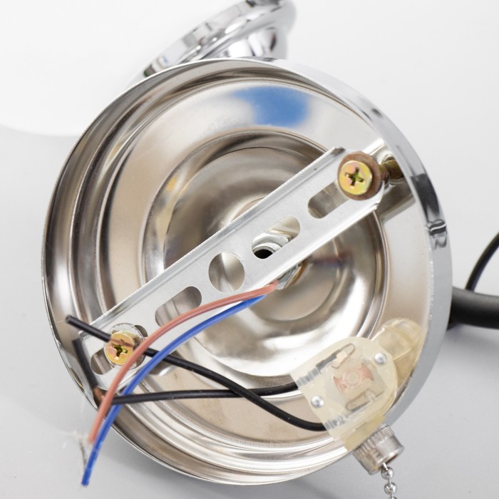 - Контрастный дизайн: Сочетание хромированного основания с черными элементами создает выразительный акцент. Белый стеклянный плафон смягчает световой поток.