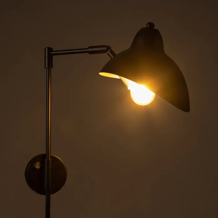 - Дизайнерский акцент: Черный металлический корпус с черным плафоном создает лаконичный и элегантный образ. Такое бра легко впишется в интерьеры в стиле лофт, модерн или минимализм, добавляя нотку урбанистической эстетики.