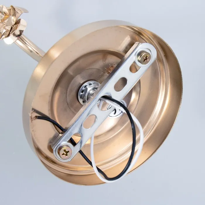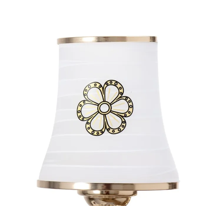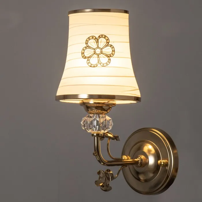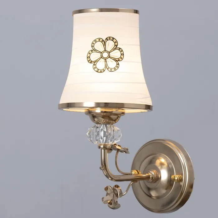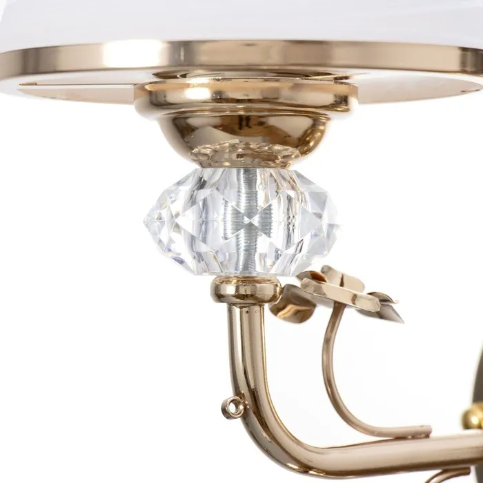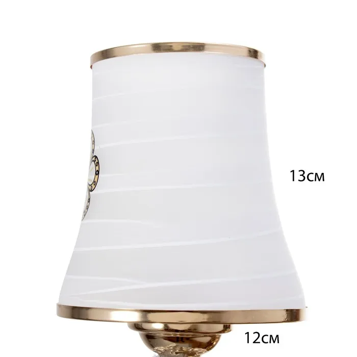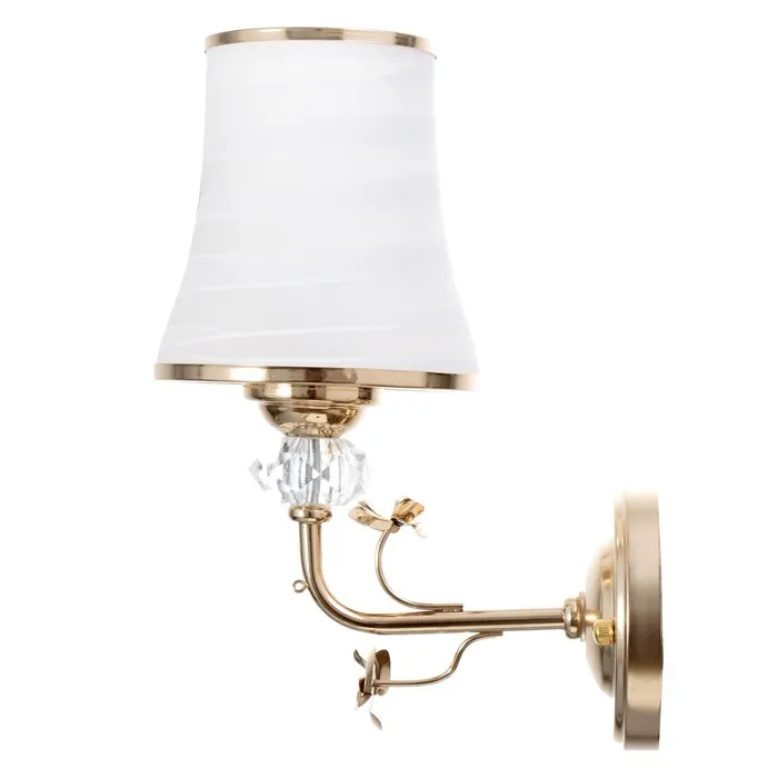 - Стеклянный рассеиватель — равномерный свет: Белый и золотой оттенки плафона создают мягкую игру света. Форма рассеивателя — нестандартная, что усиливает дизайнерский эффект и делает бра частью современной классики.