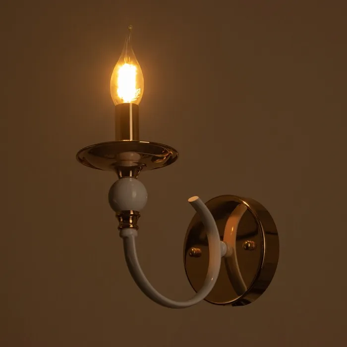 - Классический стиль: Бело-золотой металлический корпус и форма под свечу создают гармоничный образ, который легко впишется в интерьер в стиле неоклассика или классика. Такое бра станет акцентом вашего пространства, добавляя нотку роскоши.