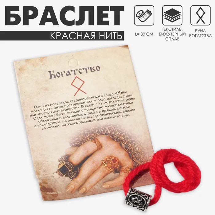Браслет-амулет на нити «Красная нить» с руной богатства, длиной 30 см, выполнен в насыщенном красном цвете с изысканным элементом из чернёного серебра. Этот стильный аксессуар сочетает в себе элегантность и мощную символику, направленную на привлечение финансового успеха, изобилия и благополучия. Универсальный размер позволяет регулировать длину, делая браслет подходящим для любого запястья.
