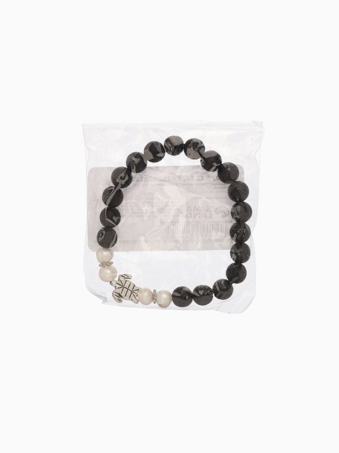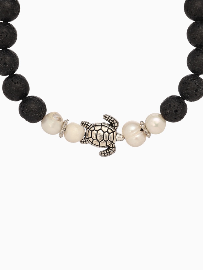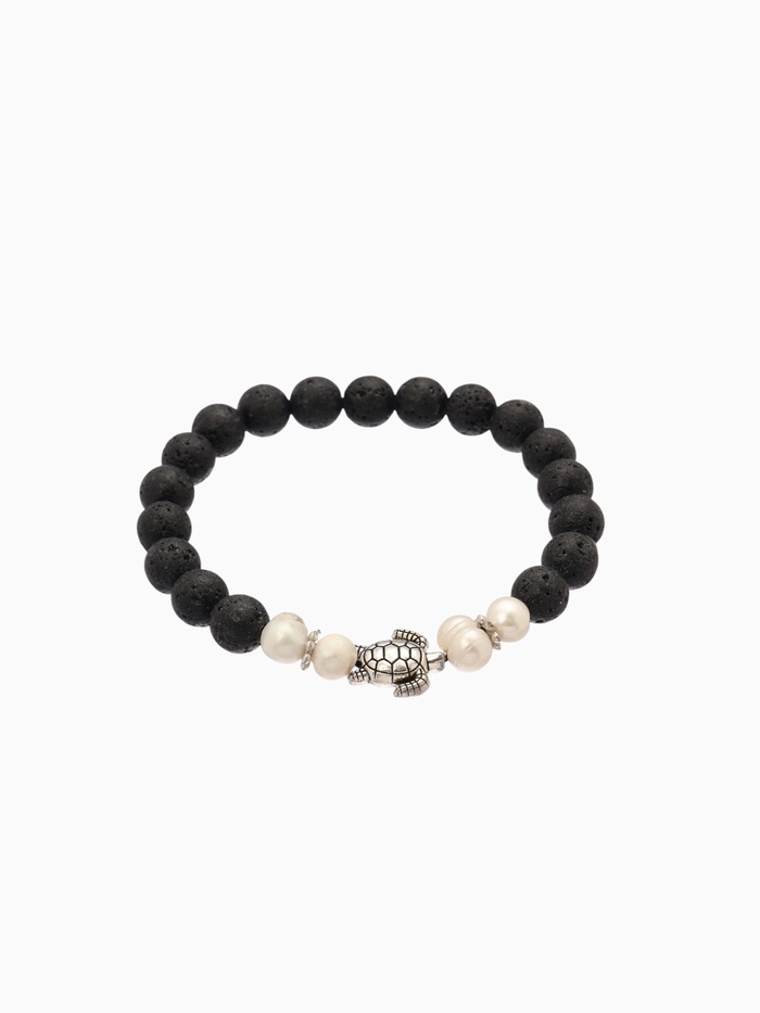 Вулканическая лава — камень заземления: он помогает справляться с эмоциональными всплесками и возвращает в настоящее. Жемчуг формируется в недрах моллюска как ответ на раздражение — потому он символизирует трансформацию боли в красоту, а также усиливает интуицию и эмоциональную чуткость. Вместе с образом черепахи они создают браслет, который работает не на показ, а на состояние — мягко, но уверенно.