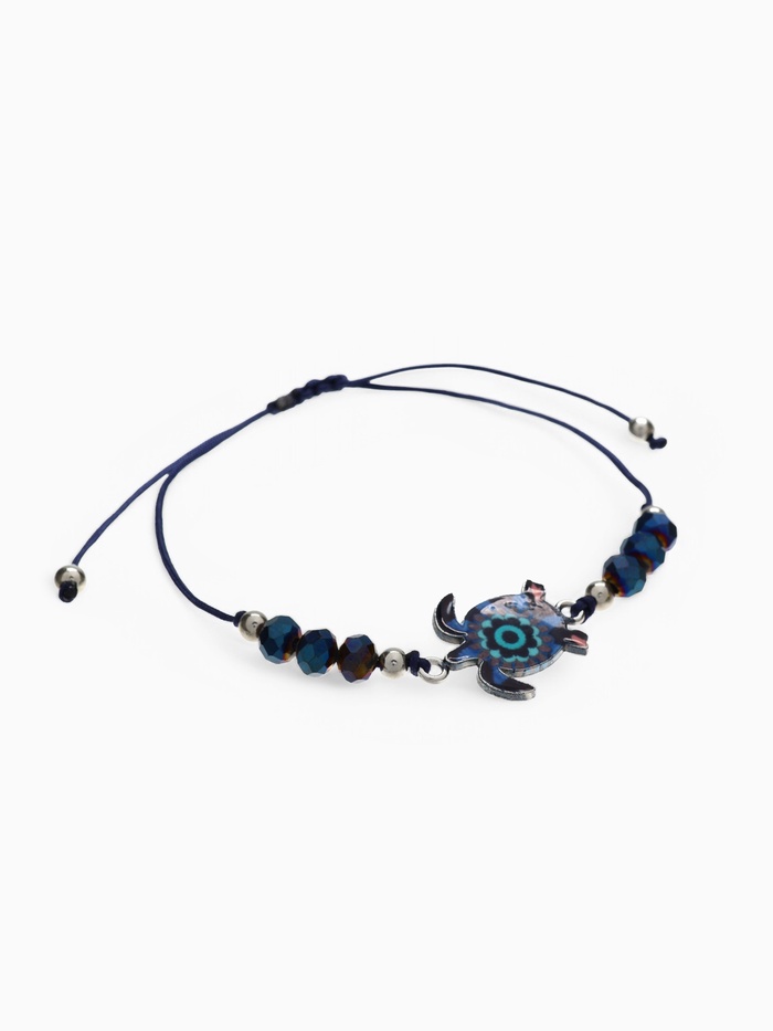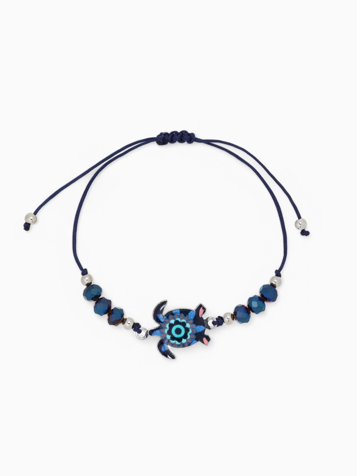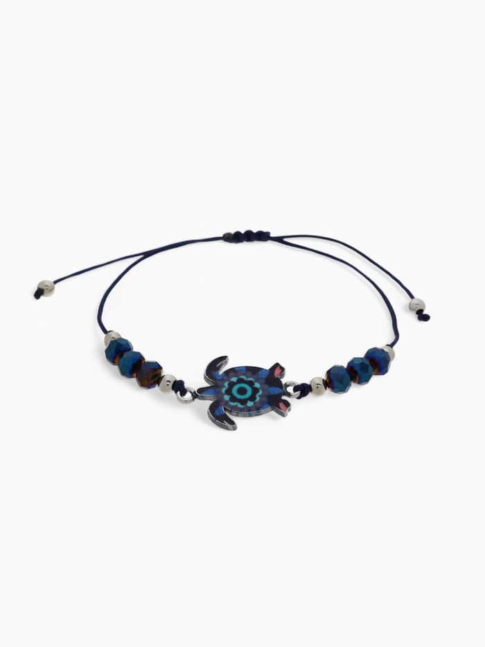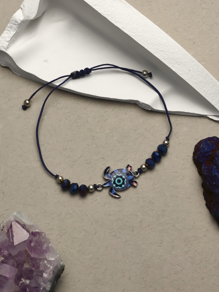 Представляем вашему вниманию стильный и оригинальный браслет с подвеской в виде черепашки, который будет настоящим акцентом в вашем гардеробе. Этот аксессуар идеально сочетает в себе элегантность и свежесть, подчеркивая вашу индивидуальность и утончённый вкус. Темно-синий цвет вставки из стекла гармонично контрастирует с основой из текстиля черного цвета, создавая образ, который привлекает внимание и вдохновляет.