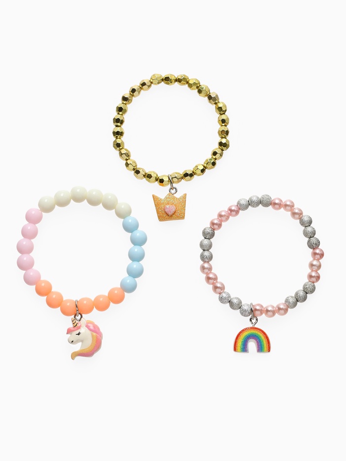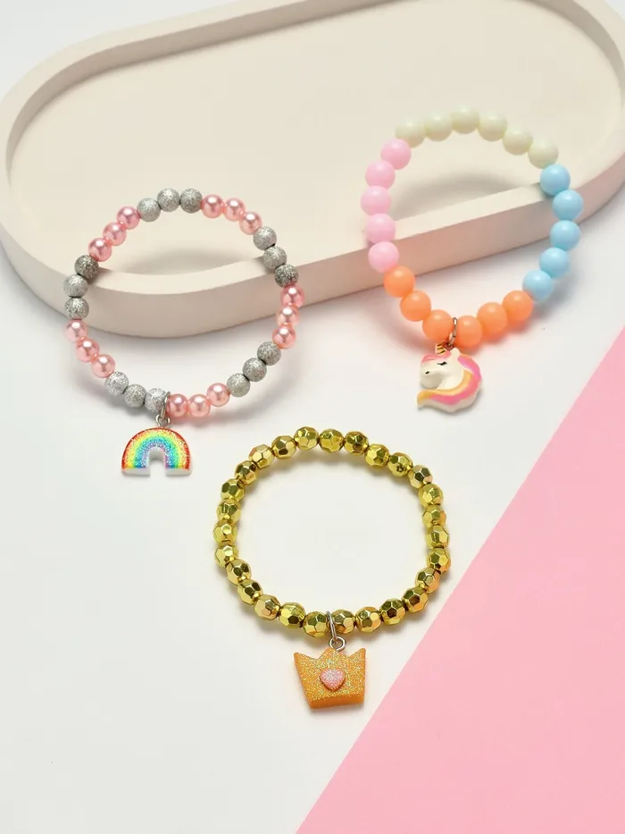Откройте для вашей маленькой принцессы мир волшебства и ярких красок с набором из трёх удивительных браслетов, каждый из которых наполнен магией единорога, радуги и короны! Эти браслеты не только станут стильным аксессуаром, но и помогут выразить её уникальность и креативность.