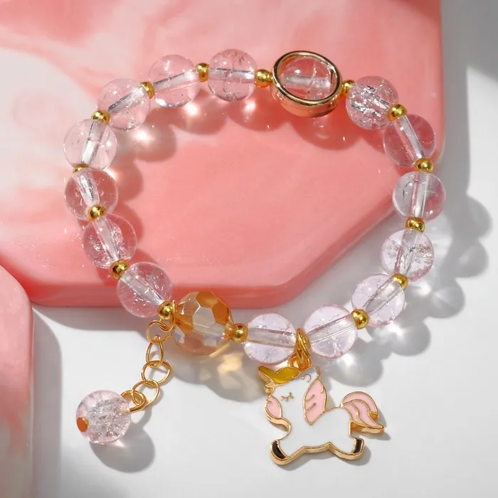 Этот браслет выполнен с использованием безопасных материалов, что делает его идеально подходящим для детей. Дизайн с единорогом станет любимым украшением для любой девочки, добавляя в её образ магии и волшебства. Браслет легко надевается и снимается, благодаря чему подходит для детей разного возраста. Розовый цвет и золотые детали делают его универсальным для сочетания с различными нарядами.