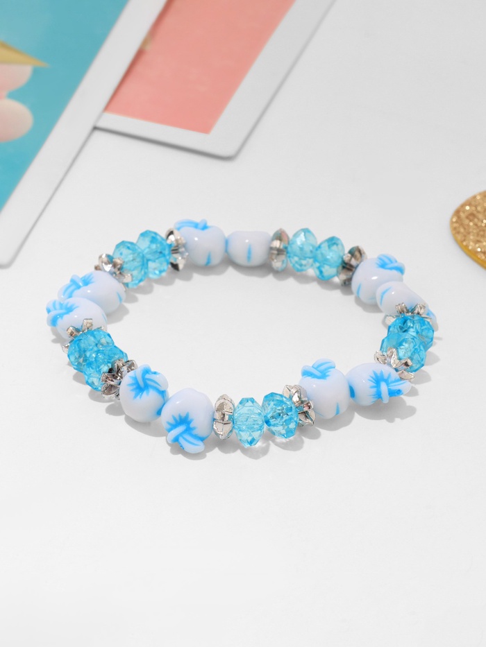 Нежный голубой браслет с ярким яблочным мотивом станет стильным и лёгким аксессуаром для девочки. Изготовленный из пластика, он отличается компактным диаметром 5 см и отсутствием застёжки, что обеспечивает удобство надевания и комфорт при носке.