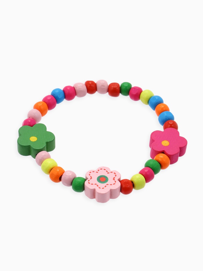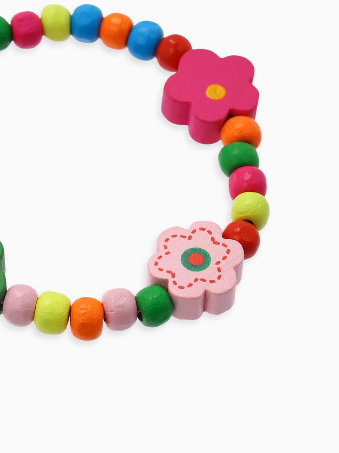 - Однониточный браслет из деревянных бусин с цветочным узором.