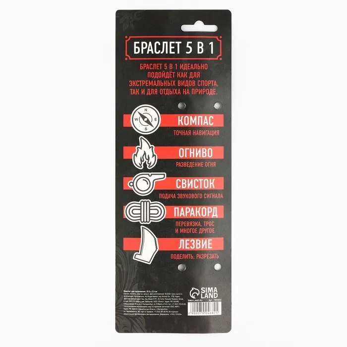 Браслет 5 в 1 идеально подойдет как для экстримальных видов спорта, так и для одтыха на природе. Очень полезная, а иногда и незаменимая вещь в походе, туристических поездках, для выживания, и просто красивый и стильный аксессуар для повседневной жизни. Можно использовать в видах спорта: рыбная ловля, охота, рафтинг, байдарка, каяк, гидроцикл, вейкборд, лодка, лыжи, самокат, ролики, скейтборд, спортивный велосипед.