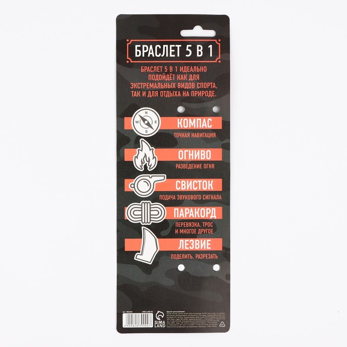 Браслет 5 в 1 идеально подойдет как для экстримальных видов спорта, так и для одтыха на природе. Очень полезная, а иногда и незаменимая вещь в походе, туристических поездках, для выживания, и просто красивый и стильный аксессуар для повседневной жизни. Можно использовать в видах спорта: рыбная ловля, охота, рафтинг, байдарка, каяк, гидроцикл, вейкборд, лодка, лыжи, самокат, ролики, скейтборд, спортивный велосипед.