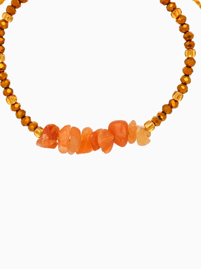 Центральный элемент браслета — минерал ярко-оранжевого цвета, олицетворяющий собой тепло солнечных лучей и древние традиции народной культуры. Окружён этот амулет тонкой позолотой, дарящей дополнительный объем и сияние, что превращает простое украшение в настоящее сокровище. Структура текстильной основы, выдержанная в классических оттенках, аккуратно подчеркивает форму изделия, предлагая ощущение удобства и свободы движения.