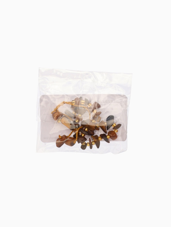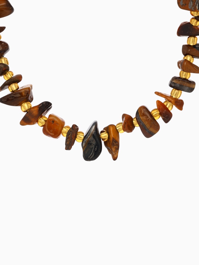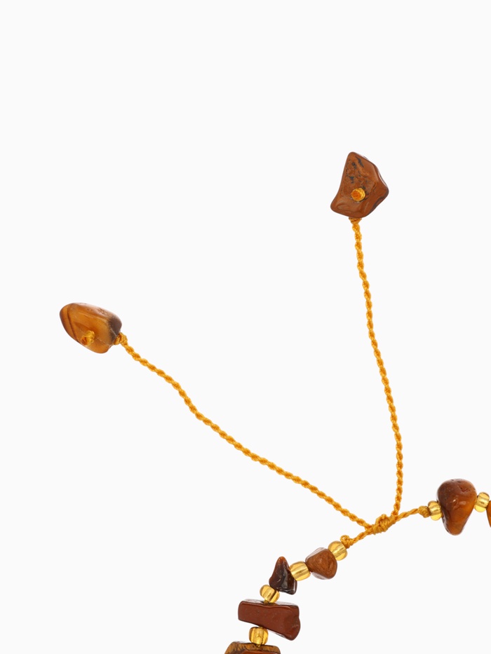 Ключевую роль играет центральный элемент — натуральный камень темно-коричневого цвета, источающий таинственность и тепло. Золотистые детали вокруг минерала символизируют энергию и силу, формируя своеобразный орнамент, будто сохранившийся с древних времен. Основание выполнено из плотной текстильной ткани, приятной на ощупь и удобной в повседневной носке.