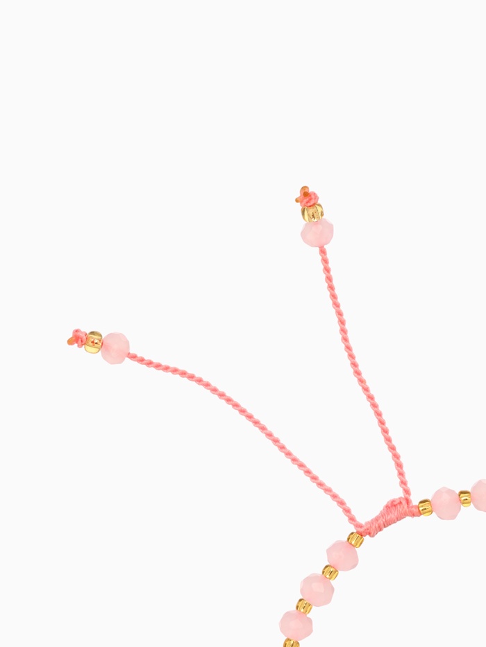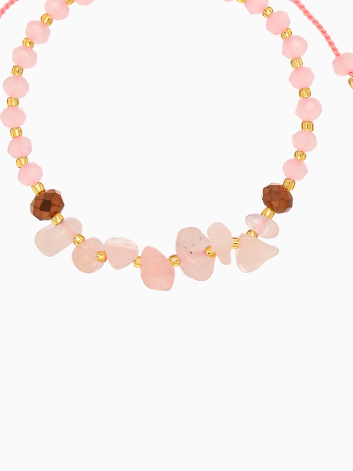 Центральным элементом композиции выступает уникальный природный камень насыщенно-розового цвета, окружённый сверкающими золотистыми элементами. Эти линии создают восхитительный контраст, притягивающий взгляд и наполняющий душу радостью и теплом. Основой служат прочные текстильные волокна нежно-розового оттенка, дарящие ощущение комфорта и легкости при ношении.