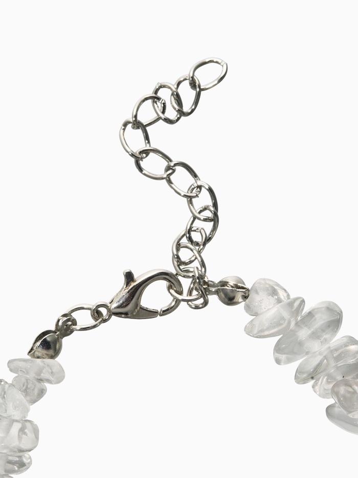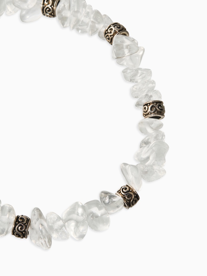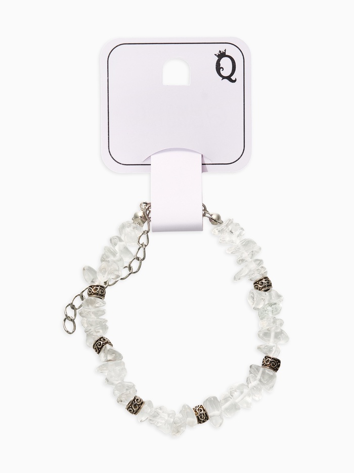 Белоснежный взгляд сквозь прозрачность камня Женский браслет из прозрачных камешков с металлическими элементами – яркий пример ювелирной идеи, наполненной легкостью и шармом. Тонкие нити искусственных камней образуют уникальное сочетание хрупкости и прочности, создав незабываемый акцент на женском запястье.