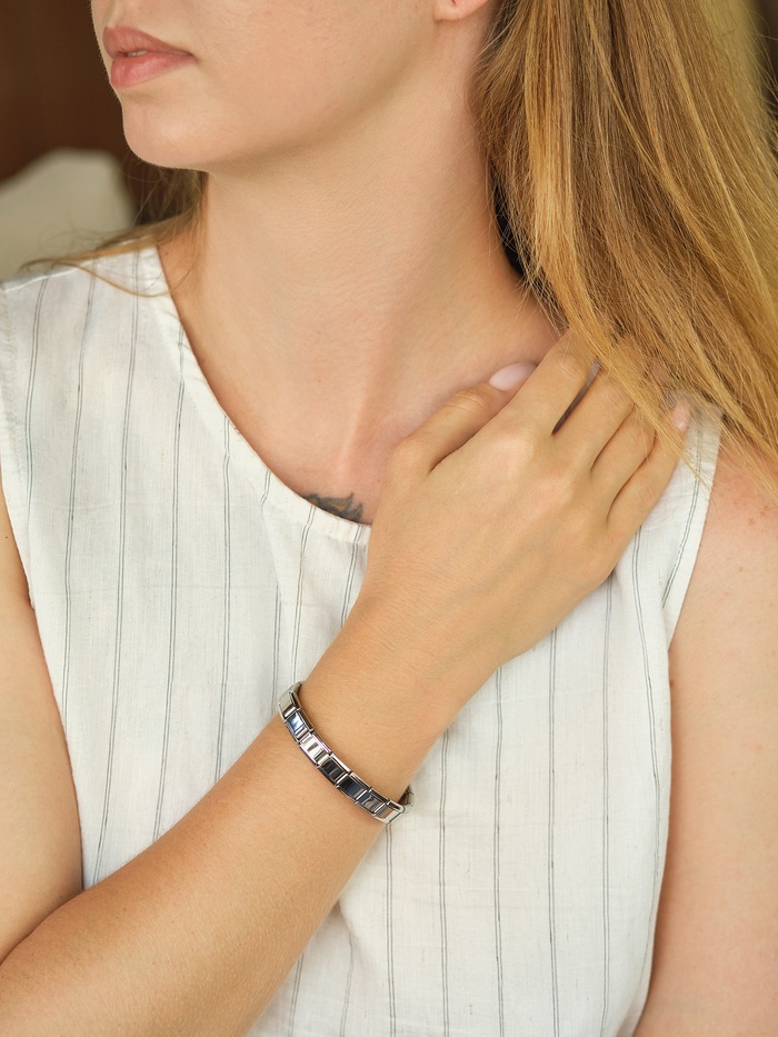 - Современный дизайн: минималистичный стиль делает браслет универсальным аксессуаром, который легко вписывается в любой гардероб.
