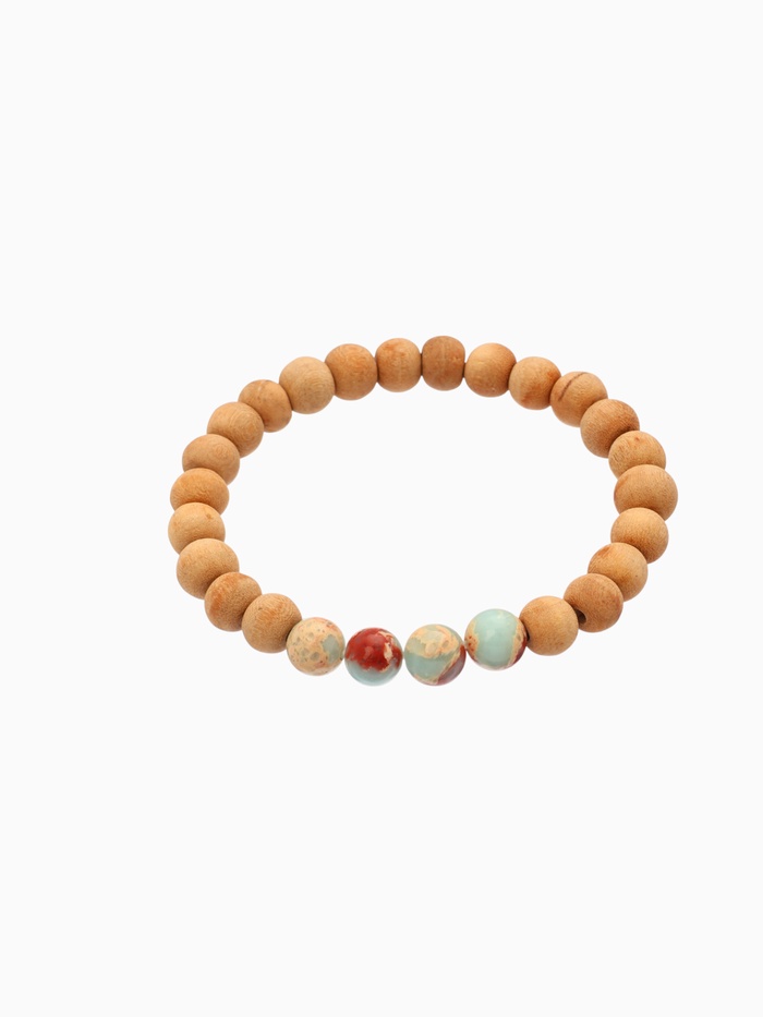 Сандаловое дерево веками использовалось в духовных практиках за его способность умиротворять ум и очищать пространство. Голубой агат — камень эмоциональной стабильности: он снижает тревожность, помогает выразить чувства и восстанавливает внутреннюю гармонию. Вместе они создают браслет, который работает не на показ, а на состояние — тихо, но постоянно.