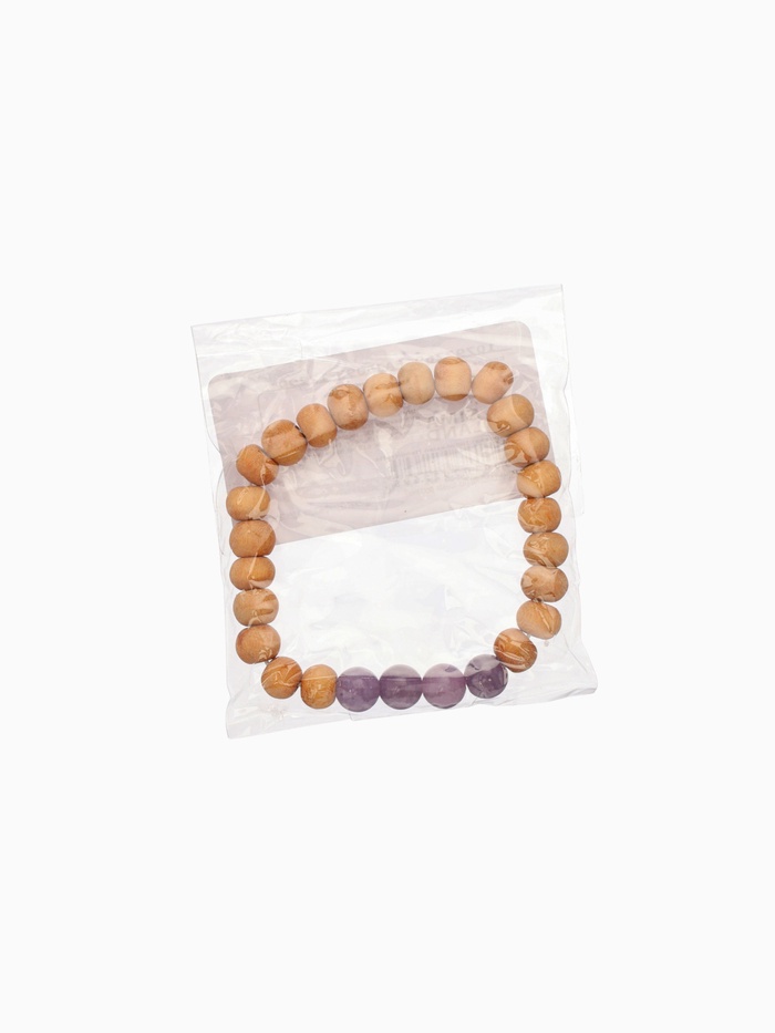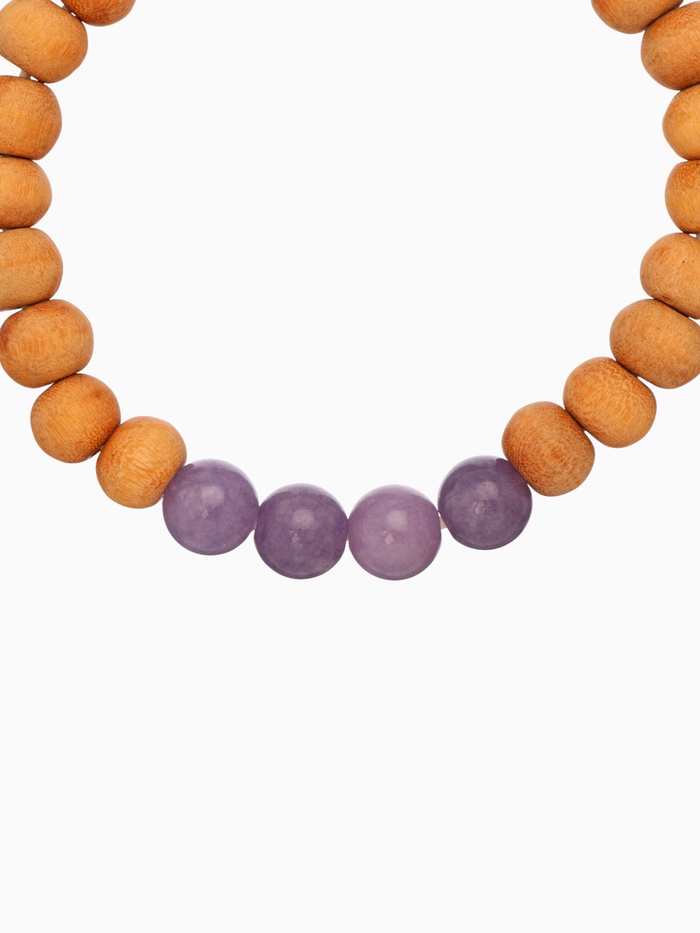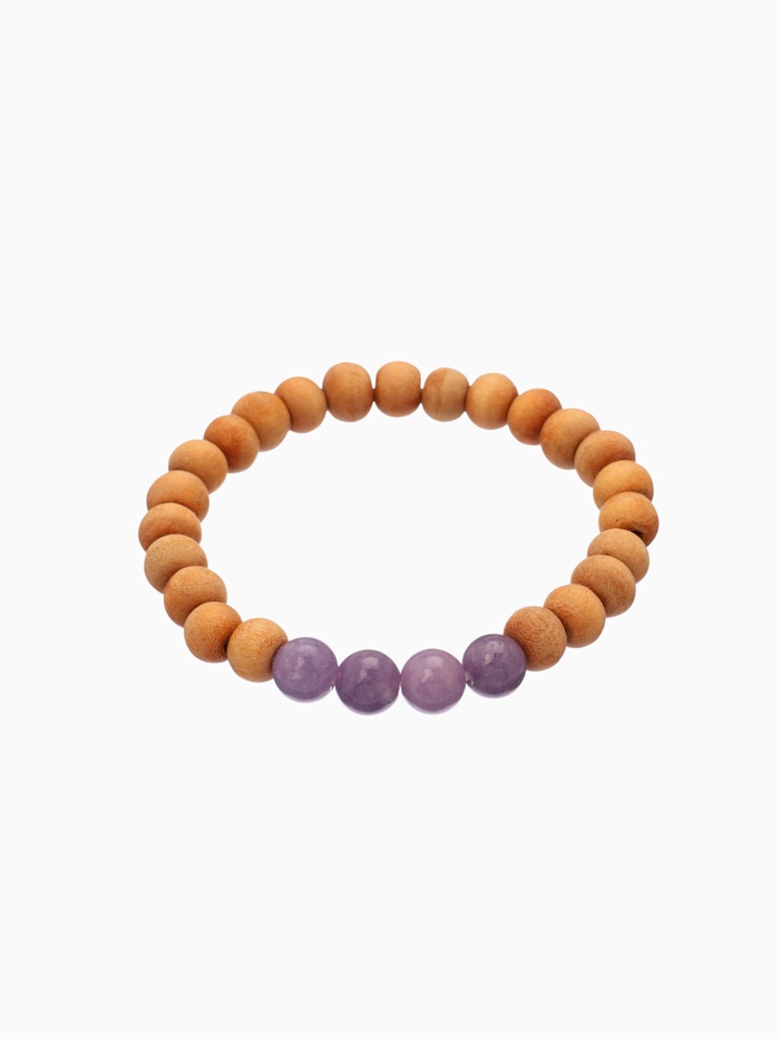 Сандаловое дерево веками использовалось в духовных практиках за его способность умиротворять ум и очищать пространство. Сиреневый агат — камень внутренней ясности: он помогает различать истинные желания от навязанных, усиливает восприимчивость и поддерживает эмоциональную гибкость. Вместе они создают браслет, который работает не на показ, а на состояние — мягко, но глубоко.
