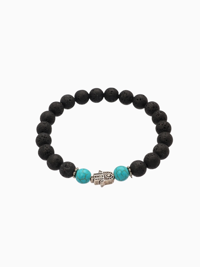 Вулканическая лава — камень заземления: он помогает справляться с тревогой, возвращает в тело и снижает внутренний шум. Пирит — “камень удачи и воли”: даже в бирюзовых тонах он усиливает уверенность, защищает от зависти и поддерживает решимость. Вместе с Хамсой они создают браслет, который работает не на показ, а на состояние — тихо, но мощно.
