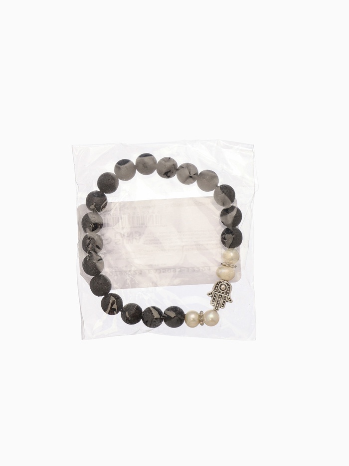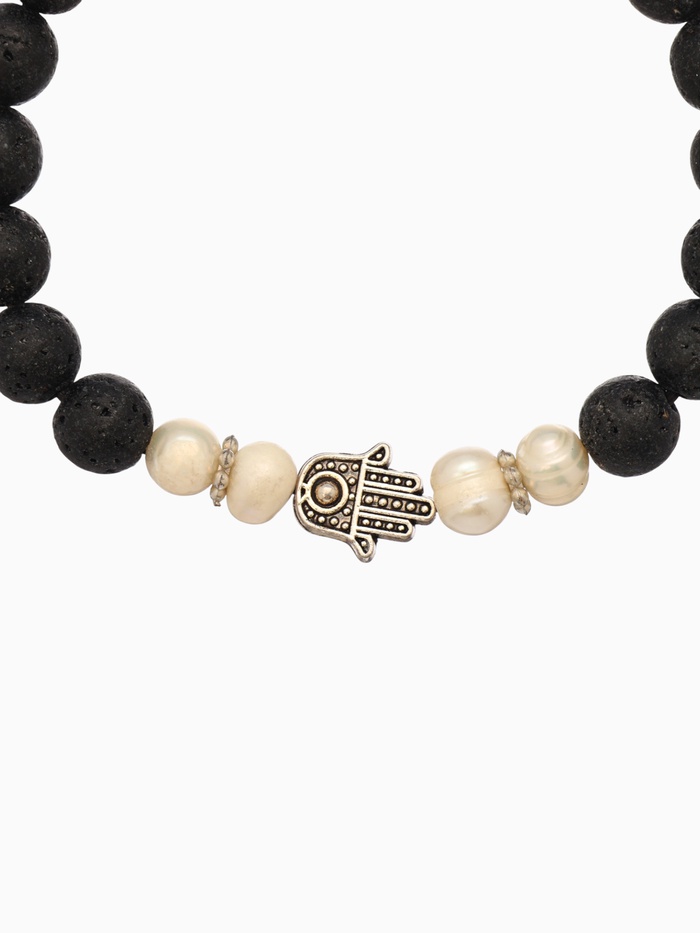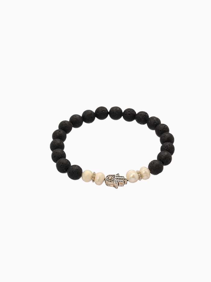 Вулканическая лава — камень заземления: он помогает справляться с тревогой, возвращает в тело и снижает внутренний шум. Жемчуг формируется в ответ на раздражение — потому он символизирует трансформацию, чистоту и эмоциональную мудрость. Вместе с Хамсой они создают браслет, который работает не на показ, а на состояние — тихо, но мощно.