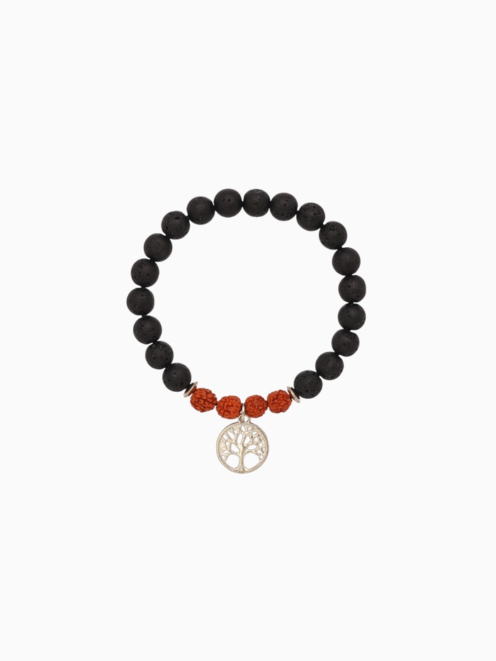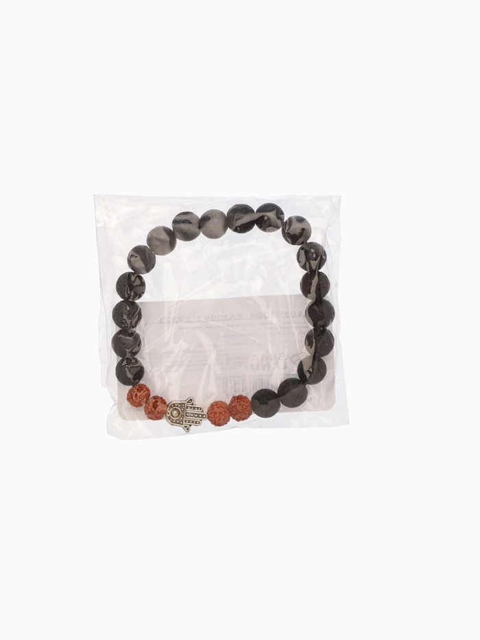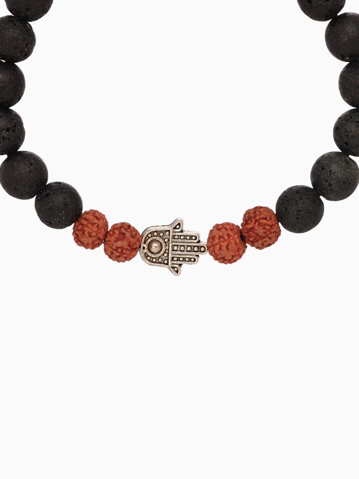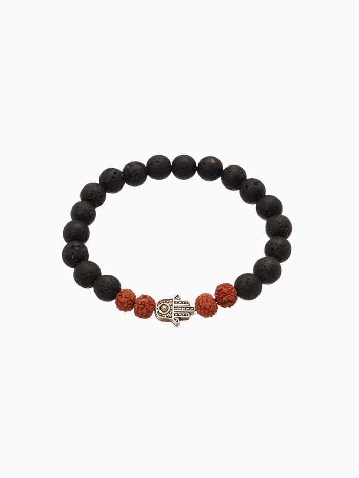Вулканическая лава — камень заземления. Его пористая структура помогает справляться с эмоциональными всплесками и внутренним напряжением. Рудракша — “слеза Шивы” — стабилизирует биоэлектрические импульсы в теле, снижает стресс и поддерживает внутренний баланс. Вместе они усиливают защитное действие Хамсы, делая браслет не просто символом, а работающим инструментом.