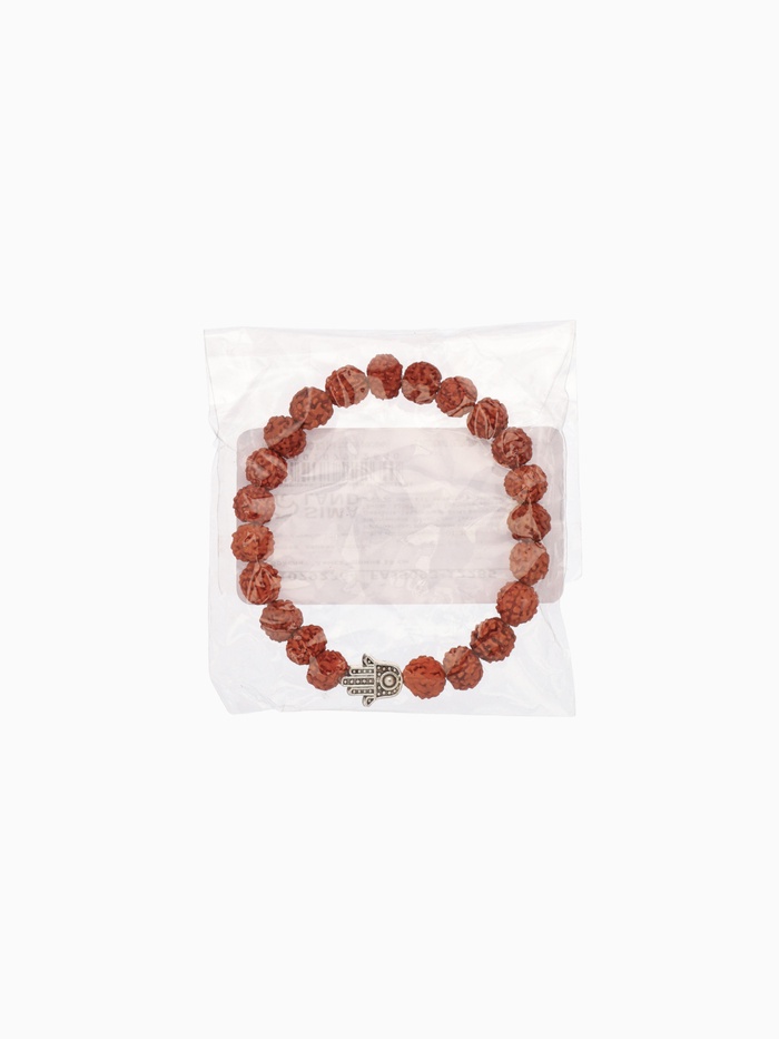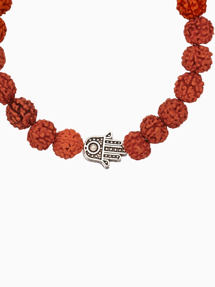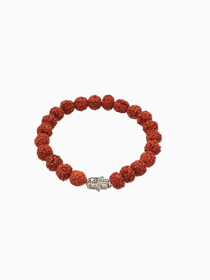 Браслет с подвеской «Хамса» из рудракши — не просто украшение, а защитный знак, вплетённый в повседневность. Его длина 18 см подходит для большинства женских запястий, а насыщенный красный оттенок бусин добавляет лёгкий акцент без излишеств. Хамса — древний символ, известный как оберег от сглаза и негатива — здесь представлена миниатюрной металлической вставкой, вплетённой в натуральную основу из рудракши.