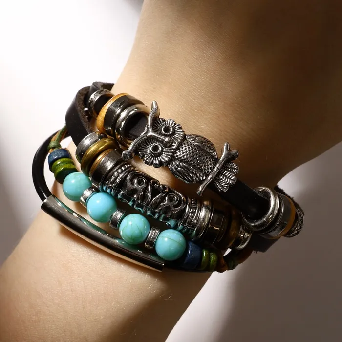 Браслет кожа «Сова» и ряд бусин, чёрный, d=9 см — Характеристики
