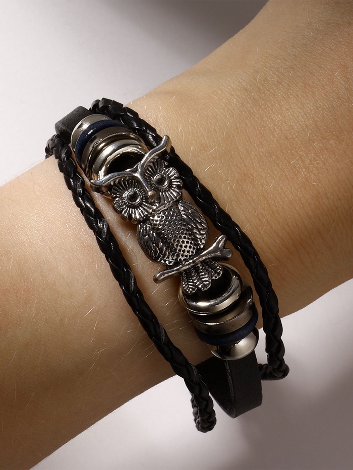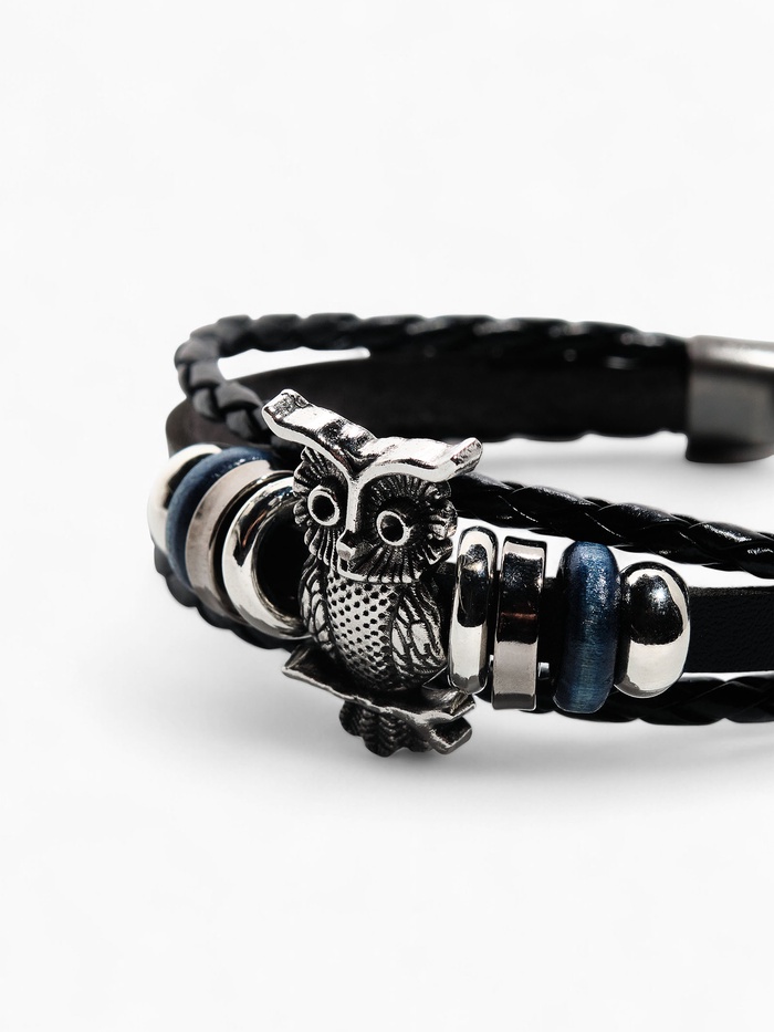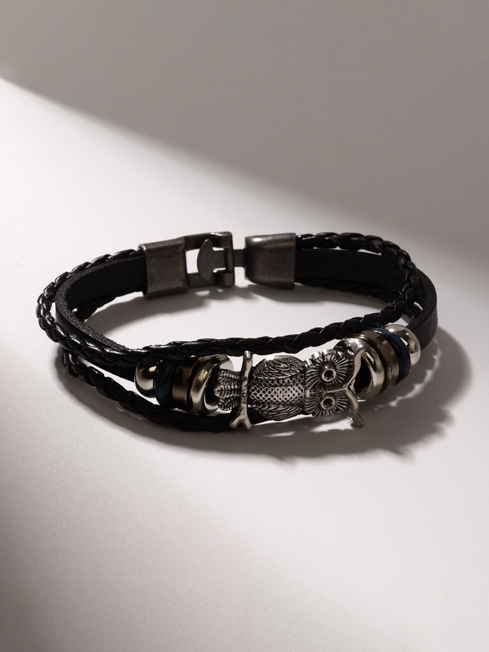 Браслет кожа «Совушка», чёрный в серебре, L=20 см — Характеристики