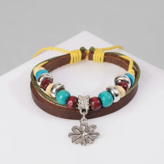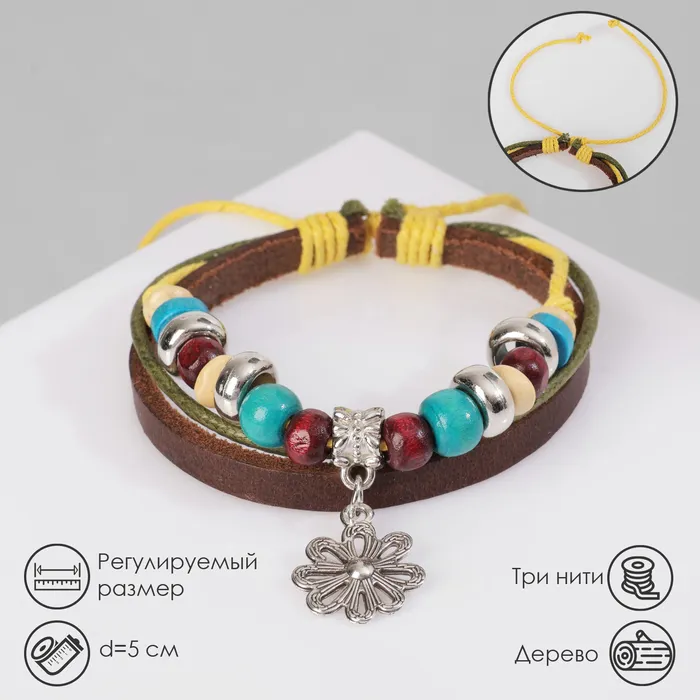 Браслет кожа «Цветок» с бусинами, 3 нити, цветной, d=5 см — Характеристики