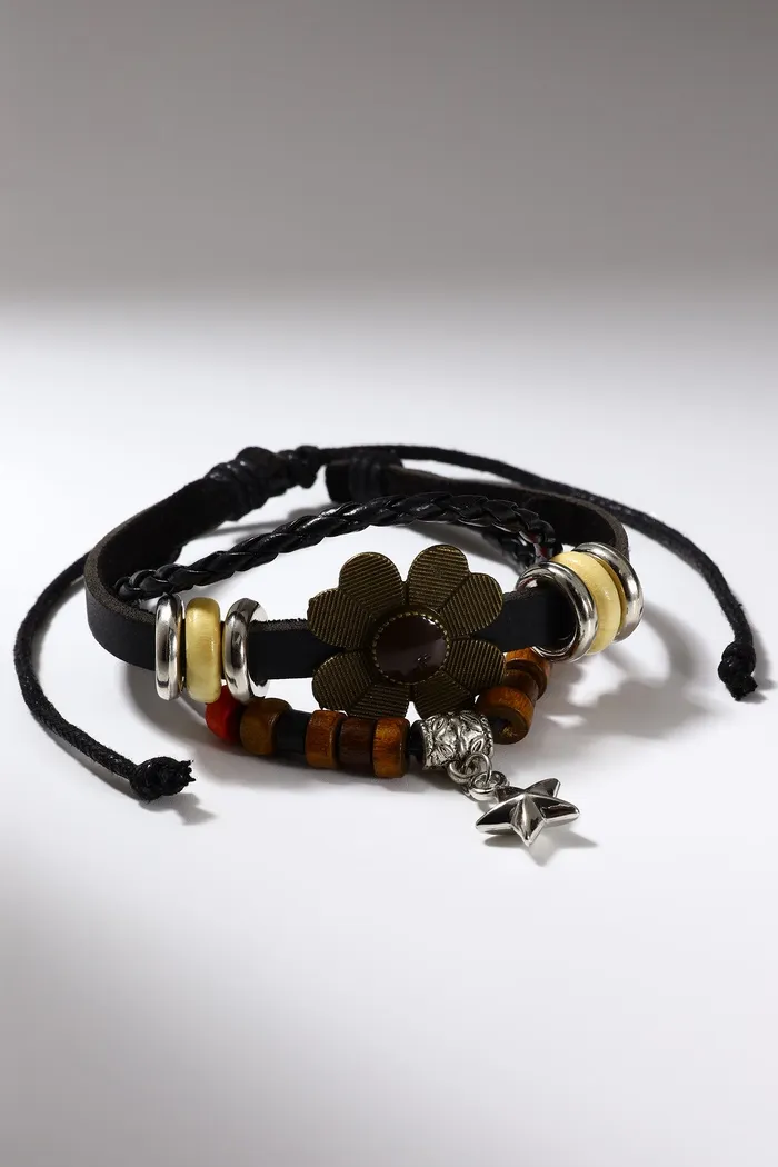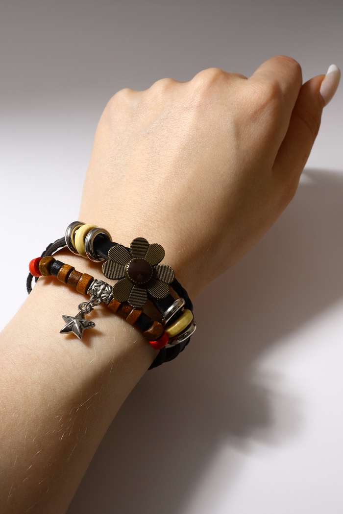 Браслет кожа «Цветок со звездочкой» хиппи, коричнево-чёрный, 6 см — Характеристики