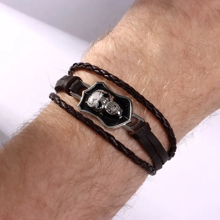 Этот мужской кожаный браслет с черепом — стильный аксессуар, который подчеркнет индивидуальность и силу характера. Коричневый цвет искусственной кожи в сочетании с серебряной фурнитурой создает выразительный образ, подходящий для повседневных образов и особых случаев. Длина 21,5 см обеспечивает комфортную посадку на запястье, а классическая T-образная застёжка делает его удобным для ношения.