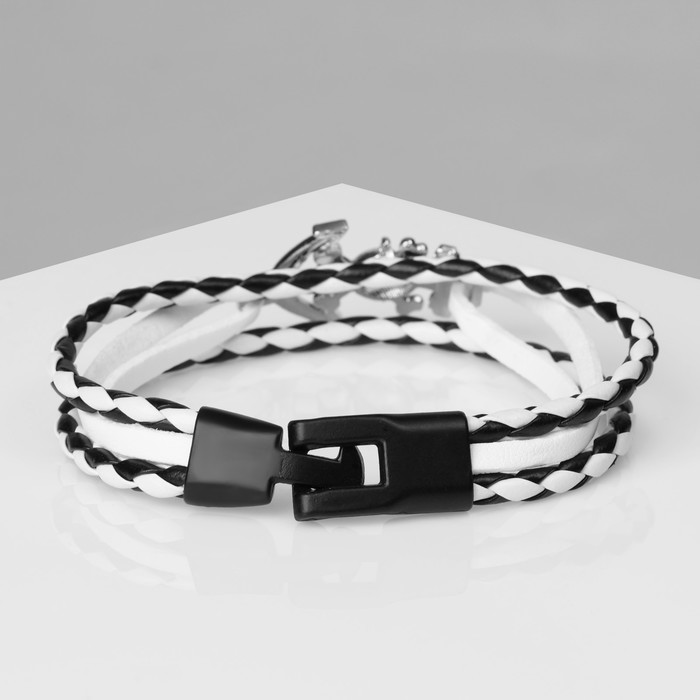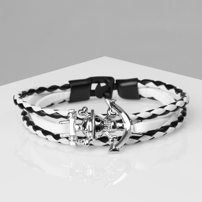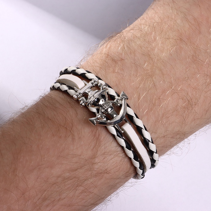 Браслет кожаный «Параллели» якорь с черепом, чёрно-белый с серебром, 21.5 см — Характеристики