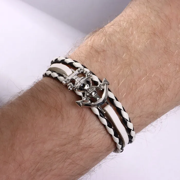 Этот мужской браслет-обруч с изображением якоря и черепа сочетает в себе морской стиль и брутальность. Бело-черная палитра с серебряной фурнитурой делает его универсальным аксессуаром для мужчин, ценящих индивидуальность и оригинальность. Длина 21,5 см обеспечивает комфортную посадку, а затяжка позволяет легко регулировать размер.