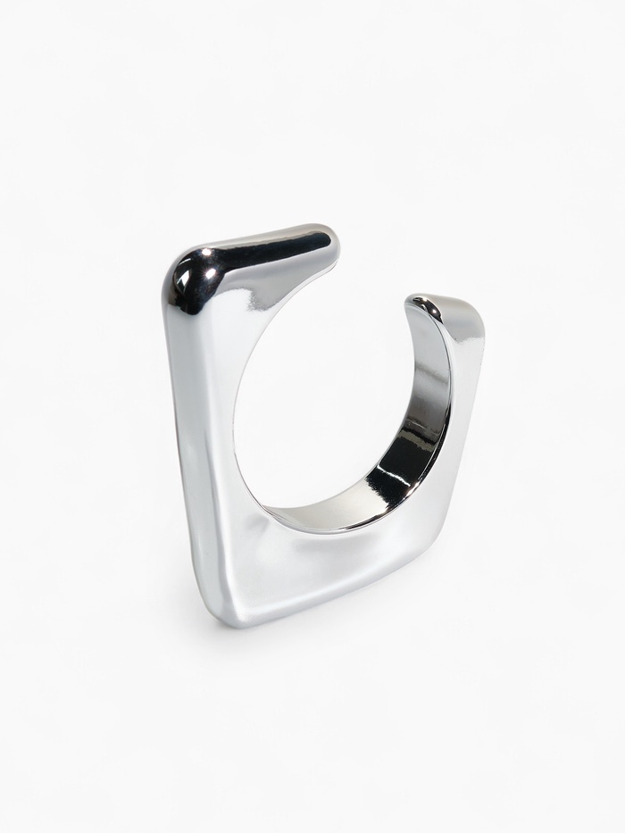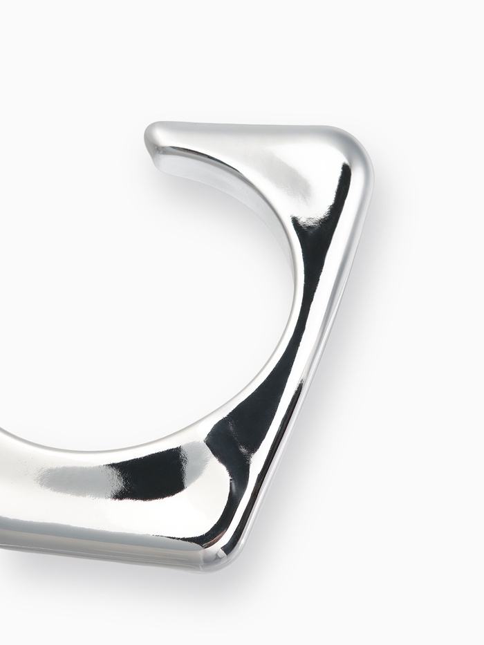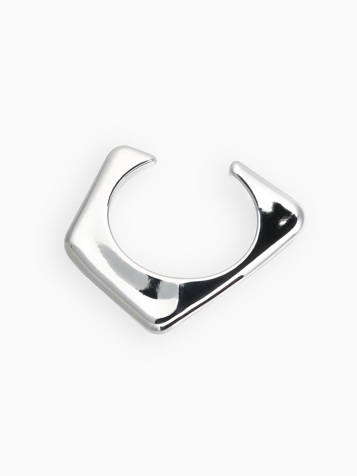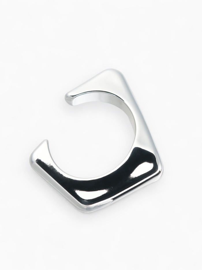 Главная особенность манжеты заключается в оригинальной комбинации прямоугольников и треугольников, плавно переходящих друг в друга. Материалы выполнены из высокотехнологичного пластика, покрытого качественным серебристым напылением, делающим поверхность гладкой и отражающей свет подобно настоящему металлу. Подобная форма создает многомерный оптический эффект, привлекая внимание и делая образ более динамичным и интересным.