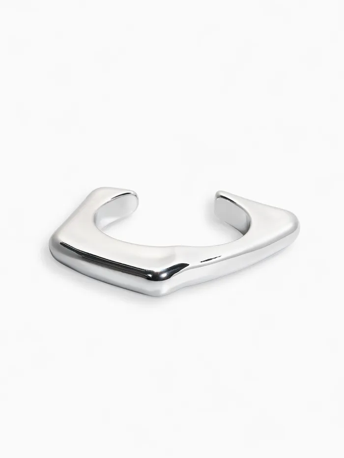 Главная особенность манжеты заключается в оригинальной комбинации прямоугольников и треугольников, плавно переходящих друг в друга. Материалы выполнены из высокотехнологичного пластика, покрытого качественным серебристым напылением, делающим поверхность гладкой и отражающей свет подобно настоящему металлу. Подобная форма создает многомерный оптический эффект, привлекая внимание и делая образ более динамичным и интересным.