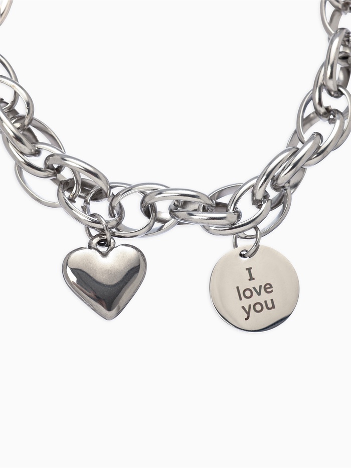 Дизайн браслета включает объёмное сердце и медальон, что придаёт ему особую романтичность и шарм. Карабинная застёжка обеспечивает надежное крепление, а цепочка добавляет динамичности и современности. Этот аксессуар станет прекрасным дополнением как к повседневным, так и к вечерним нарядам.