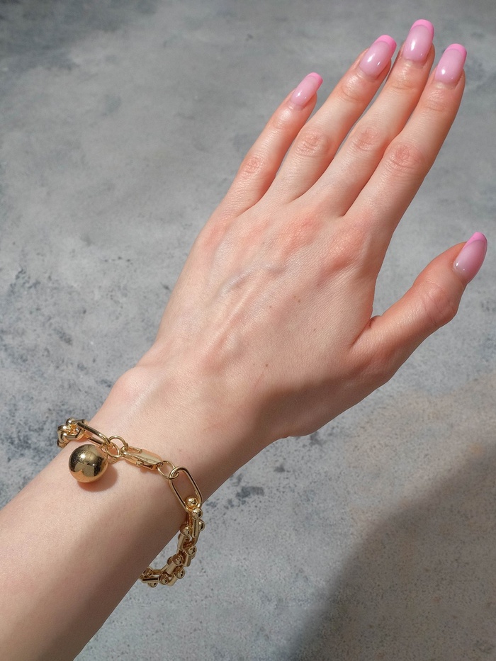 Золотистый металлический браслет длиной 22 см представляет собой элегантное украшение, способное стать ярким акцентом в любом образе. Его лаконичный дизайн в виде цепочки с шарообразными звеньями подчёркивает утончённость и женственность, придавая образу лёгкую роскошь и современный стиль.