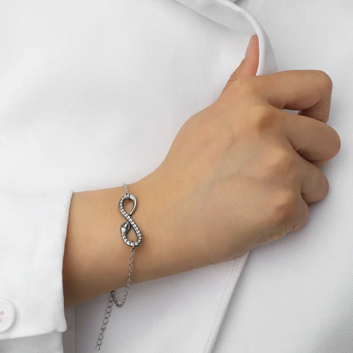 Позвольте себе окунуться в мир элегантности и стиля с этим великолепным браслетом в виде бесконечности, выполненным из высококачественного металла серебристого цвета. Его длина в 18 см идеально соответствует женскому запястью, подчеркивая изящество и утонченность вашей руки.