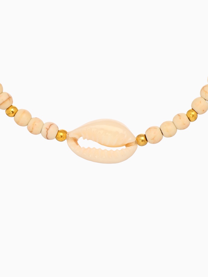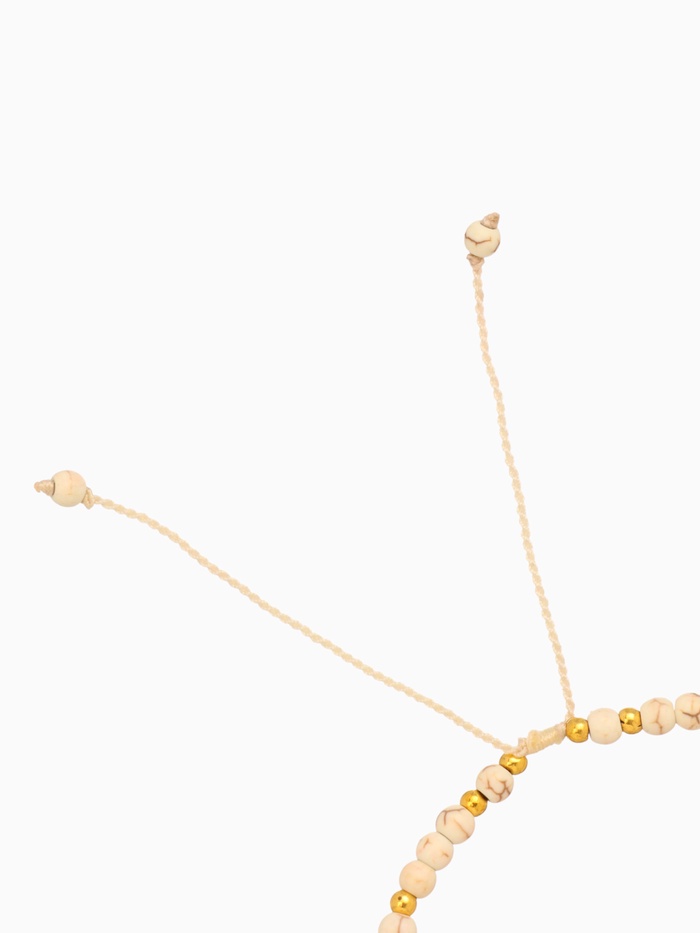 Центр внимания — красивая белая ракушка, внутренняя поверхность которой интригует блеском пирита, похожего на маленькие звезды, рассыпавшиеся внутри. Внешне она украшалась тонким серебряным контуром, дополнительно подчеркивающим геометрию ракушки и ее элегантность. Белая текстильная основа сплетена с точностью ювелира, обеспечивая комфорт при носке и удобство затяжной застежки.