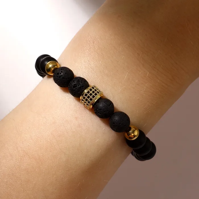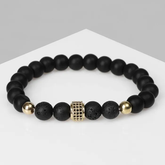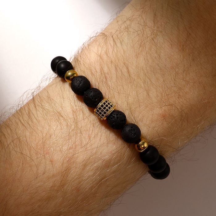 Этот мужской браслет из бусин выполнен из искусственного камня черного цвета и украшен металлическими элементами с фианитами и стеклом в золотом оттенке. Его длина 7 см делает его удобным аксессуаром для запястья взрослого мужчины. Браслет без застёжки, с силиконовой основой, обеспечивает комфортную посадку и современный стиль. Такой аксессуар подойдет для повседневного ношения или в качестве подарка на День рождения и 23 Февраля.