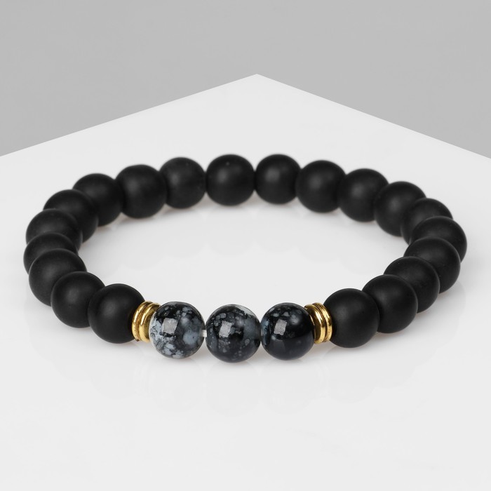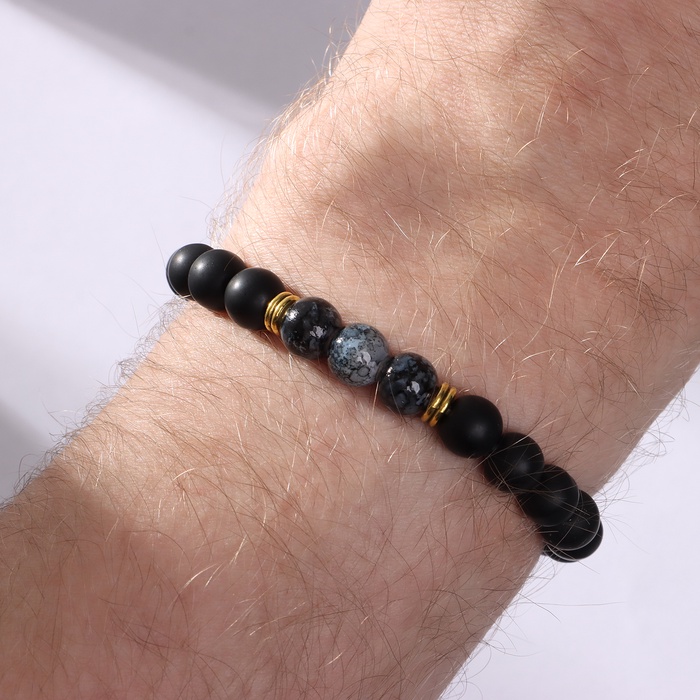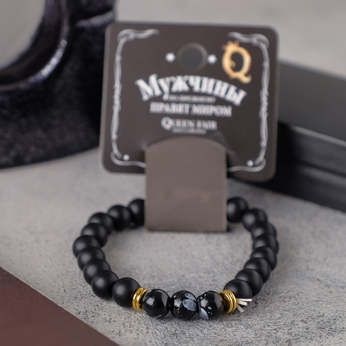Акцентные золотые металлические элементы и вставки из стекла придают украшению выразительность и статусность, создавая эффектный контраст с чёрным цветом силиконовых бусин диаметром 8 мм. Этот аксессуар выступает не просто украшением, а символом мужской силы и уверенности, подчеркивая индивидуальность образа.