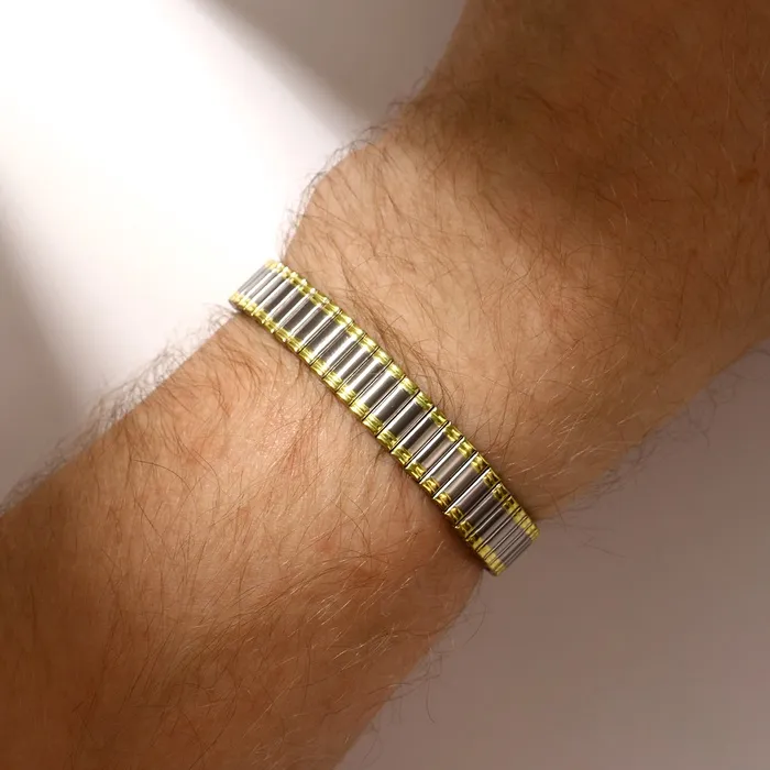 Этот браслет из нержавеющей стали с прямоугольными звеньями в сочетании золотого и серебряного оттенков создает уникальный акцент в мужском образе. Его современный дизайн и гармоничное сочетание цветов делают его универсальным аксессуаром, который подчеркнет статус и индивидуальность владельца.