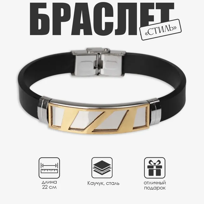 Этот мужской браслет-обод из каучука и стали сочетает в себе современный стиль и выразительный дизайн. Черный цвет с серебряно-золотым акцентом делает его универсальным аксессуаром, подходящим для повседневных образов и особых случаев. Размер 22 см обеспечивает комфортную посадку на запястье, а складная застёжка гарантирует надежное крепление.